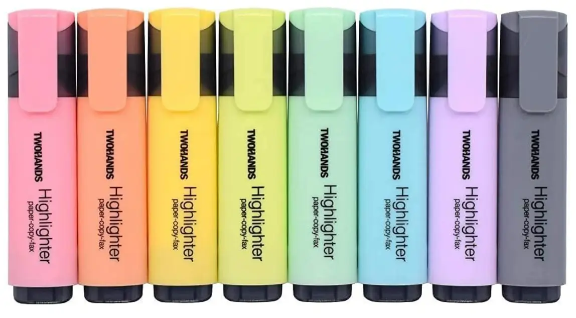 TWOHANDS Highlighters with chisel tips deliver smooth, consistent ink flow for clean highlighting without bleeding through most paper. The eight assorted pastel colors are gentle on the eyes and perfect for organizing notes, textbooks, and planners. A large ink reservoir provides extra-long marking performance, so you can highlight more pages without frequent replacements